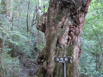仏陀杉。横から見ると仏様が座禅をくんでいるように見えることからこの名前がついたとか。