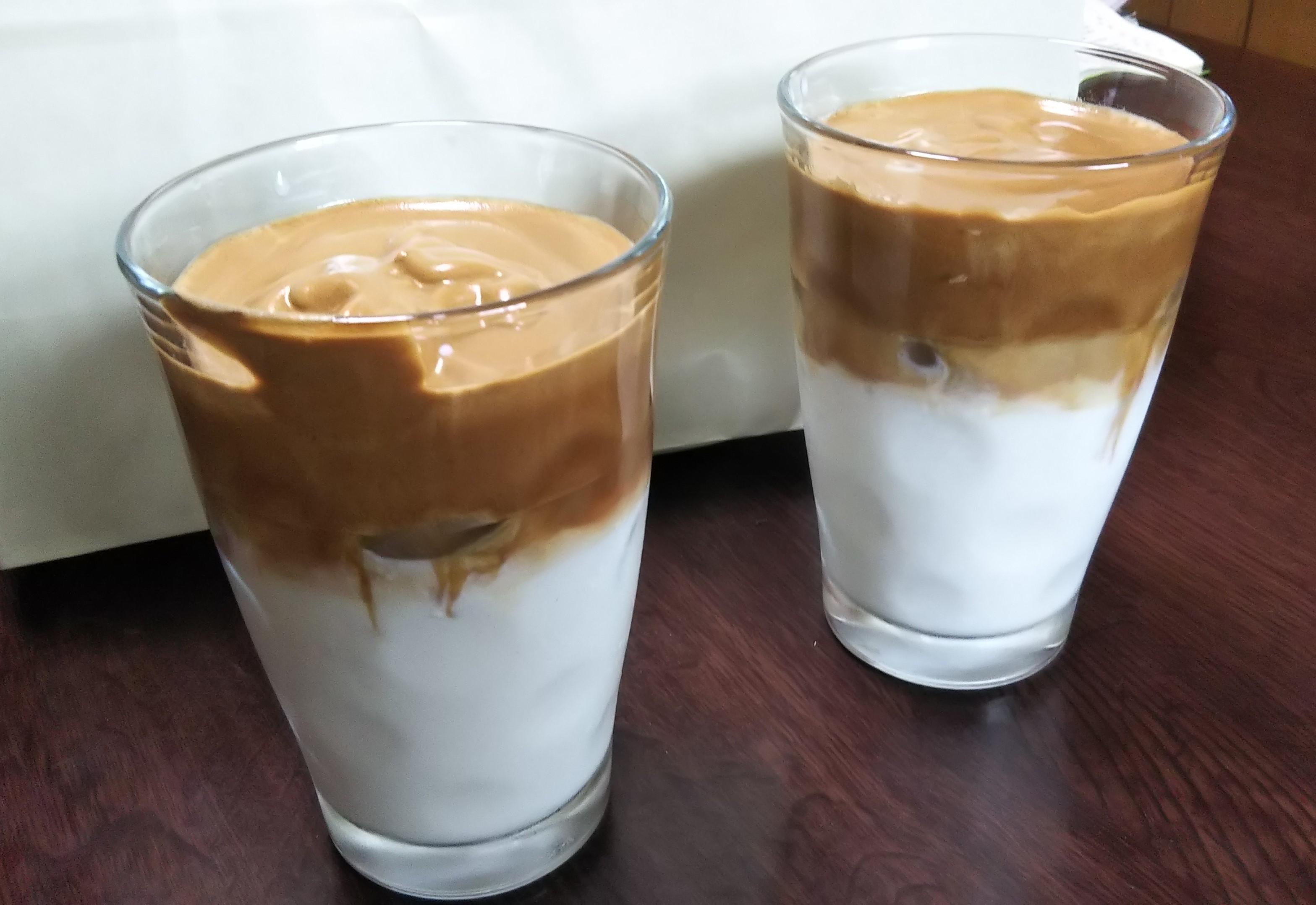 ふわふわのクリーム状になったら、氷を入れたグラスに牛乳を2/3入れて、
